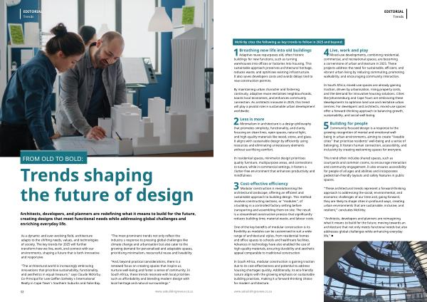 “ And, beyond practical considerations, there is a renewed focus on creating spaces that inspire us, nurture well-being and foster a sense of community. In South Africa, these trends resonate with local priorities such as affordability and blending modern design with local heritage and natural surroundings.”