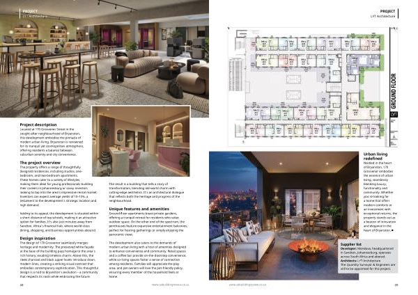 Supplier list Developer: Merelava, headquartered in Sandton, Johannesburg, operates across South Africa and aborad. Architects: LYT Architecture The Quantity Surveyor & Engineers are still to be appointed for this project. www. sabuildingreview. co. za 49