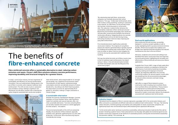 “ By substituting steel with fibres, construction companies can markedly decrease their carbon emissions,” Fick says.“ Unlike steel reinforcement, which often involves cutting and fitting, resulting in substantial scrap material, our Advil fibres can be precisely mixed into concrete, minimising waste on construction sites. This reduction in waste further enhances the sustainability credentials of fibre-reinforced concrete.” Beyond the environmental advantages, fibre reinforced concrete offers several practical benefits that enhance construction efficiency. Integrating fibres into concrete is straightforward and can be done during mixing, eliminating the labour-intensive steps of placing and tying steel reinforcement.