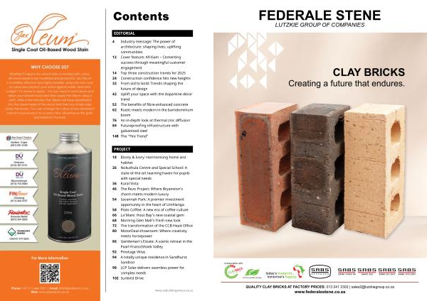 12 Cover feature: AfriSam – Cementing success through meaningful customer engagement 14 Top three construction trends for 2025 24 Construction confidence hits new heights 32 From old to bold: Trends shaping the future of design 42 Uplift your space with the dopamine decor trend 52 The benefits of fibre-enhanced concrete 62 Rustic meets modern in the barndominium boom 76 An in-depth look at thermal zinc diffusion 84 Futureproofing infrastructure with galvanised steel 148 The“ Fire Trend”