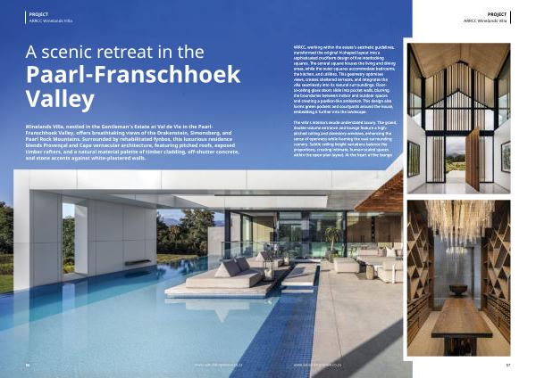 Winelands Villa, nestled in the Gentleman’ s Estate at Val de Vie in the Paarl- Franschhoek Valley, offers breathtaking views of the Drakenstein, Simonsberg, and Paarl Rock Mountains. Surrounded by rehabilitated fynbos, this luxurious residence blends Provençal and Cape vernacular architecture, featuring pitched roofs, exposed timber rafters, and a natural material palette of timber cladding, off-shutter concrete, and stone accents against white-plastered walls.