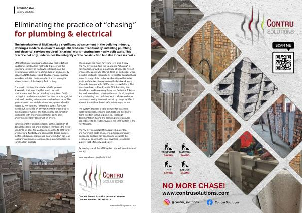 Chasing was the norm for years, let’ s stop it now. The NMC system offers the solution to“ chasing” in construction, providing a multitude of benefits. First, it ensures the continuity of brick force on both sides when installed vertically, thanks to its integrated serrated hoop irons. Its rough finish enhances bonding with mortar joints and plaster, strengthening the brickwork since it ' s made from durable 25MPa concrete with fibre. The system reduces rubble by up to 90 %, boosting ecofriendliness and increasing the green footprint. It keeps the work area clean, reducing the need for drying time and minimising dust pollution, which allows trades to commence, saving time and electricity usage by 90 %. It also minimises health and safety risks to personnel.