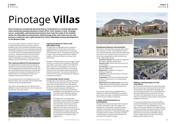 In the scenic region of Klapmuts, Western Cape, the Pinotage Villas development has become a shining example of what can be achieved in affordable housing. Spearheaded by Devco Group, this pioneering estate has successfully completed the sale of 196 houses, marking it as the first security-focused affordable development in the area – a project that sold out by February 2021. Pinotage Villas stands as a testament to innovative design, sustainability, and community-focused living, making it a jewel in South Africa’ s real estate crown.