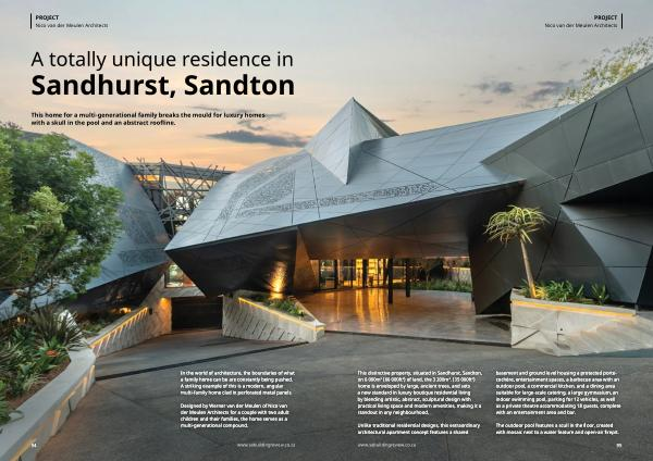 This distinctive property, situated in Sandhurst, Sandton, on 6 000m 2( 66 000ft 2) of land, the 3 200m 2.( 35 000ft 2) home is enveloped by large, ancient trees, and sets a new standard in luxury boutique residential living by blending artistic, abstract, sculptural design with practical living space and modern amenities, making it a standout in any neighbourhood. basement and ground level housing a protected portecochère, entertainment spaces, a barbecue area with an outdoor pool, a commercial kitchen, and a dining area suitable for large-scale catering, a large gymnasium, an indoor swimming pool, parking for 12 vehicles, as well as a private theatre accommodating 18 guests, complete with an entertainment area and bar.
