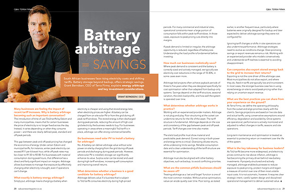 What is the key takeaway for business leaders? As ToU tariffs become more widespread, and electricity prices continue to rise above inflation, arbitrage is fast becoming the primary driver behind new battery investments. If properly structured and actively managed, arbitrage enables businesses to reduce exposure to peak pricing, protect margins and regain a measure of control over one of their most volatile input costs. It is not automatic, however. It requires clear strategic intent, careful system design and disciplined operational management to deliver sustained value. �