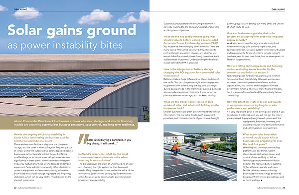 In Alumo’ s experience, what are the most common mistakes businesses make when investing in solar solutions? The biggest issues are a lack of understanding of solar and choosing the right system for their business’ s needs. Many companies do not realise the value of the investment. Solar systems usually pay for themselves within five years while continuing to provide reliable power and energy stability.