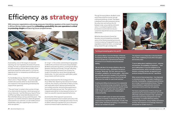 While the diamond sector frames the discussion around traceability and shared value, similar themes are playing out across mineral processing. Energy performance, long regarded as a technical metric, is increasingly being viewed through a strategic lens. sabusinessintegrator. co. za 29