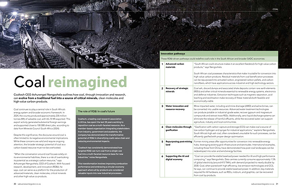 “ Coal can provide the stable baseload power needed for AI and high-performance computing,” says Nengovhela. Data centres currently consume approximately 1.5 % of global electricity( around 415 TWh), with demand projected to nearly double by 2030. Coal, when paired with high-efficiency, low-emission technologies and CCS, he says, can continue to provide stable baseload power. In addition, key materials required for AI hardware, such as REEs, niobium, and graphite, can be recovered from coal by-products. sabusinessintegrator. co. za 31