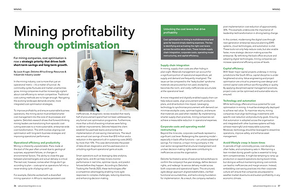 Capital efficiency With fewer major capital projects underway in mining jurisdictions like South Africa, capital discipline is under heightened scrutiny. Value engineering and project optimisation are critical to preventing over-design and control capital costs without sacrificing safety or quality. By applying disciplined capital management practices, project costs can be optimised and sustainable returns ensured.
