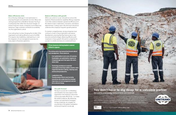 Unitrans provides seamless on- and off-mine services including drilling & blasting, crushing & screening, load & haul, stockpile management, and more. From the fi rst drill to the fi nal delivery, we manage all the logistics – allowing you to cut down on operational expenses and increase profi t. All while maintaining strict safety standards. www