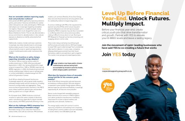 How are renewable solutions improving supply chain and production resilience? Solar paired with BESS significantly improves production uptime, particularly in factories and distribution centres where interruptions are costly and disruptive. FMCG and retail players are increasingly integrating renewables into logistics. Shoprite is a notable example, having deployed an electric truck charged from solar at its Basson Distribution Centre. This not only demonstrates a serious commitment to decarbonisation, it also reduces exposure to diesel price volatility and potential fuel supply shocks.