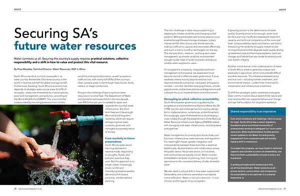 A guiding principle worth embracing is this: we all live downstream. Water connects us all – across sectors, communities, and ecosystems. Its sustainability is not optional; it is a shared imperative. � sabusinessintegrator. co. za 71