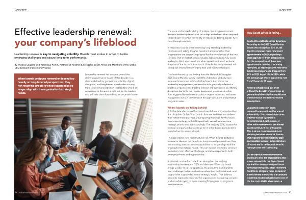 Leadership renewal has become one of the defining governance issues of this decade. In a climate defined by geopolitical volatility, digital disruption, and heightened stakeholder scrutiny, there is growing recognition that leaders who ' d got companies to this point might not be the leaders who will take them forward into an uncertain future.