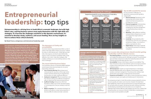 As an entrepreneur and international leadership coach now living in South Africa, I have witnessed firsthand the dynamic landscape of our economy and the critical role entrepreneurs play in its growth. With approximately 2.8 million entrepreneurs in the country, as reported by the Global Entrepreneurship Monitor( GEM), they contribute significantly to job creation, economic development and innovation. Despite this potential, the reality is sobering: studies from the University of the Western Cape indicate that 70-80 % of small businesses fail within the first five years. I strongly believe that understanding the factors behind this high failure rate is crucial for those of us looking to thrive in this environment.