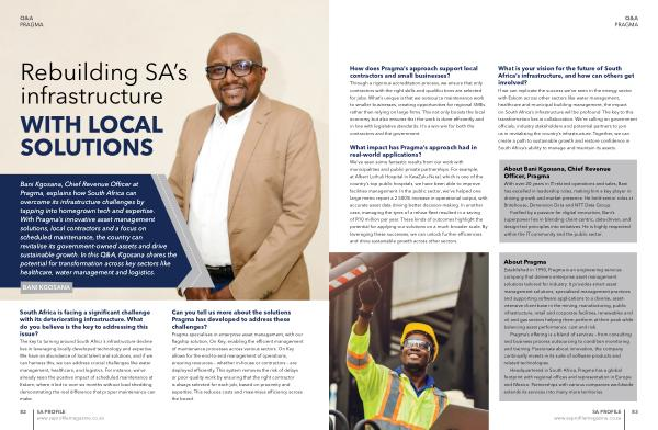 Bani Kgosana, Chief Revenue Officer at Pragma, explains how South Africa can overcome its infrastructure challenges by tapping into homegrown tech and expertise. With Pragma’ s innovative asset management solutions, local contractors and a focus on scheduled maintenance, the country can revitalise its government-owned assets and drive sustainable growth. In this Q & A, Kgosana shares the potential for transformation across key sectors like healthcare, water management and logistics.