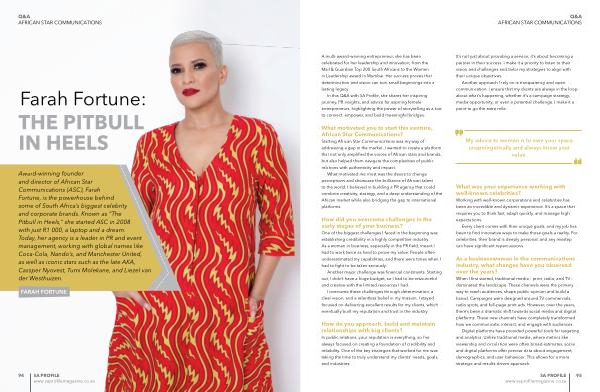 Award-winning founder and director of African Star Communications( ASC), Farah Fortune, is the powerhouse behind some of South Africa’ s biggest celebrity and corporate brands. Known as“ The Pitbull in Heels,” she started ASC in 2008 with just R1 000, a laptop and a dream. Today, her agency is a leader in PR and event management, working with global names like Coca-Cola, Nando’ s, and Manchester United, as well as iconic stars such as the late AKA, Cassper Nyovest, Tumi Molekane, and Liezel van der Westhuizen.