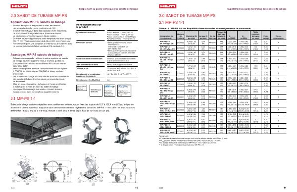 Sabots de tubage unitaires réglables avec revêtement extérieur pour fixer des tuyaux de 12,7 à 152,4 mm ( 1 / 2 po à 6 po ) de diamètre à divers matériaux supports dans des environnements légèrement corrosifs . MP-PS 1-1 est offert en trois hauteurs différentes : bas ( 3 1 / 2 po à 4 9 / 16 p ), moyen ( 4 9 / 16 po à 6 11 / 16 po ) et haut ( 6 11 / 16 po à 8 3 / 4 po ).