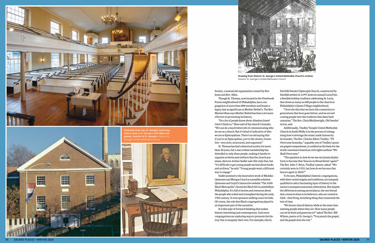 Clockwise from top: St. George’ s sanctuary. Asbury desk at St. George’ s with Bible and glasses. Exterior of St. George’ s. Historic St. George’ s United Methodist Church