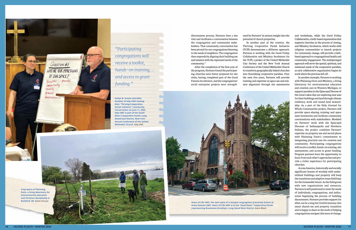 In another example, Partners is working with Plainsong Farm and Ministry, a living laboratory for environmental education and creation care in Western Michigan, to support parishes in the Episcopal Diocese of the Great Lakes that are exploring new uses for their buildings and land through climate resiliency work and sound land stewardship. As a part of the Holy Ground for Whole Communities project, Partners will provide space-sharing training and space asset inventories and facilitate community conversations with stakeholders. Modeled on Partners’ work with the Episcopal Dioceses of Indianapolis and Northern Indiana, the project combines Partners’ expertise on property use and sacred places with Plainsong Farm’ s commitment to integrating practical care for creation and community. Participating congregations will receive a toolkit, hands-on training, site assessments, and access to grant funding. Program partners have the opportunity to learn from each other’ s approaches and provide a richer experience for participating churches.