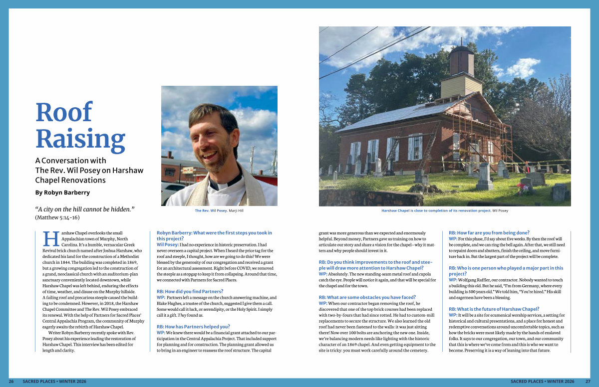 RB: Do you think improvements to the roof and steeple will draw more attention to Harshaw Chapel? WP: Absolutely. The new standing-seam metal roof and cupola catch the eye. People will notice it again, and that will be special for the chapel and for the town.