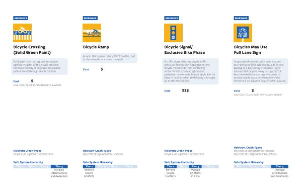 Solid green paint across an intersection signifies the path of the bicycle crossing . Increases visibility of bicyclists ’ anticipated path of travel through an intersection .