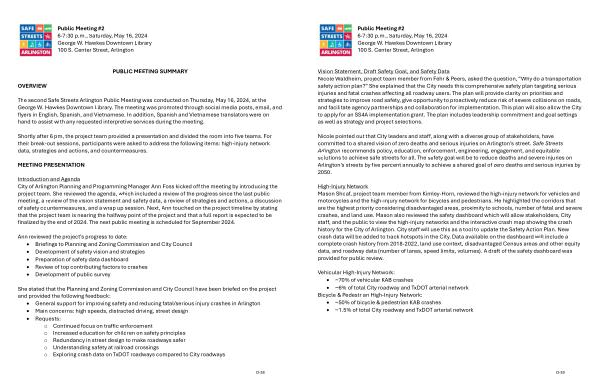 The second Safe Streets Arlington Public Meeting was conducted on Thursday , May 16 , 2024 , at the George W . Hawkes Downtown Library . The meeting was promoted through social media posts , email , and flyers in English , Spanish , and Vietnamese . In addition , Spanish and Vietnamese translators were on hand to assist with any requested interpretive services during the meeting .