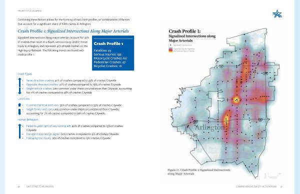 Signalized intersections along major arterials account for 32 % of crashes that result in a death , serious injury , and / or minor injury in Arlington , and represent 41 % of KAB crashes on the High-Injury Network . The following trends are found with crash profile 1 :