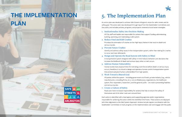 An action plan was developed to achieve Safe Streets Arlington ' s vision for safer streets and its safety goal . The action plan was developed through input from the Stakeholder Committees and the public , and includes policies , programs , and projects centered around seven strategies :
