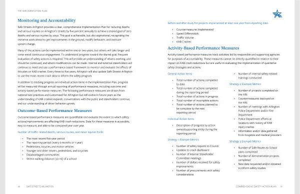 In addition to tracking progress on individual action items in the Implementation Plan , progress will be measured through annual reporting of performance measures , including outcome and activity-based performance measures . The following performance measures are drawn from national best practices and customized for Arlington but will evolve in future years as the understanding of KAB crashes expands , conversations with the public and stakeholders continue , and our understanding of driver behaviors grows .