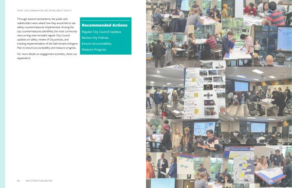 Through several mechanisms , the public and stakeholders were asked how they would like to see safety countermeasures implemented . Among the top countermeasures identified , the most commonly reoccurring ones included regular City Council updates on safety , review of City policies , and tracking implementation of the Safe Streets Arlington Plan to ensure accountability and measure progress .