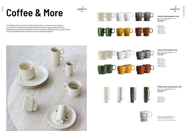 Ilmeikkäällä reliefekuvioinnilla somistettu Coffee & More on tuotesarja, jonka Sagaform on suunnitellut yhteistyössä muotoilija Margot Marolon kanssa. Sarja noudattaa 70-luvun selväpiirteistä ja leikillistä muotokieltä. Eri osista, kuvioista ja väreistä koostuvan sarjan tuotteita on kiva yhdistellä keskenään. Astiat ovat mikron ja konepesun kestäviä.