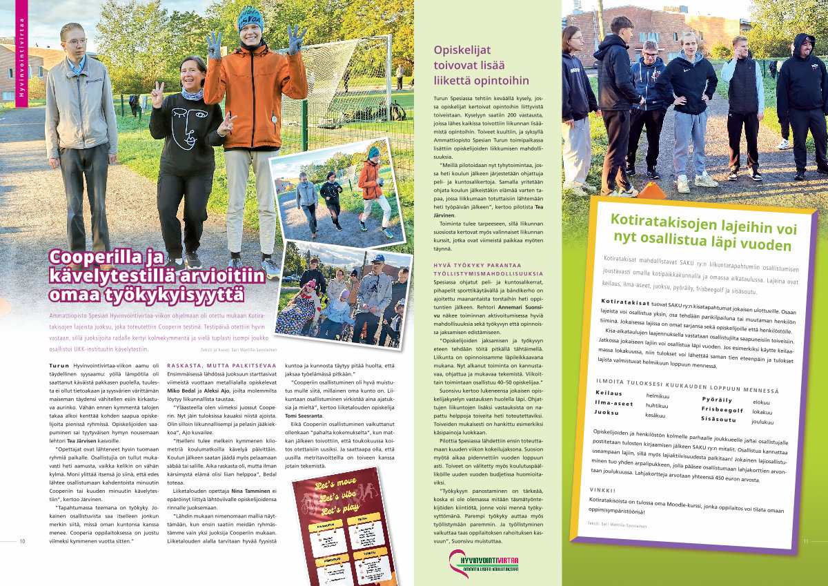 Turun Hyvinvointivirtaa-viikon aamu oli täydellinen syysaamu: yöllä lämpötila oli saattanut käväistä pakkasen puolella, tuulesta ei ollut tietoakaan ja syysvärien värittämän maiseman täydensi vähitellen esiin kirkastuva aurinko. Vähän ennen kymmentä talojen takaa alkoi kenttää kohden saapua opiskelijoita pienissä ryhmissä. Opiskelijoiden saapuminen sai tyytyväisen hymyn nousemaan lehtori Tea Järvisen kasvoille.