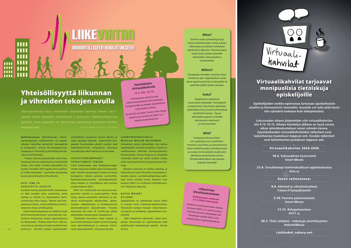 Kutsu meidät kylään! Oppilaitosten on mahdollista kutsua SAKU ry mukaan omiin Liikevirtaa-tapahtumiinsa. Vierailuille tuodaan mukaan Liikevirtaa-toimintapiste ja kohdataan oppilaitoksen henkilöstöä.