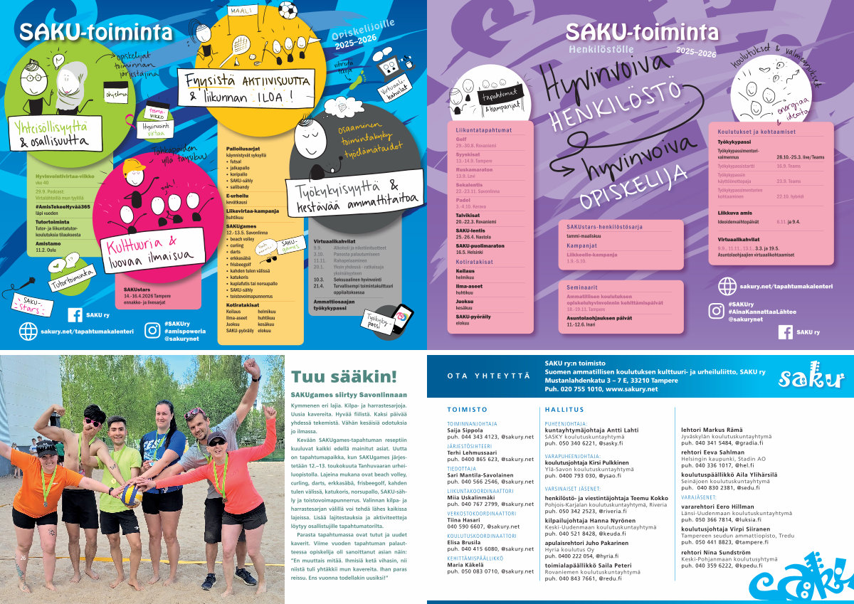 SAKU ry: n toimisto Suomen ammatillisen koulutuksen kulttuuri- ja urheiluliitto, SAKU ry Mustanlahdenkatu 3 – 7 E, 33210 Tampere Puh. 020 755 1010, www. sakury. net