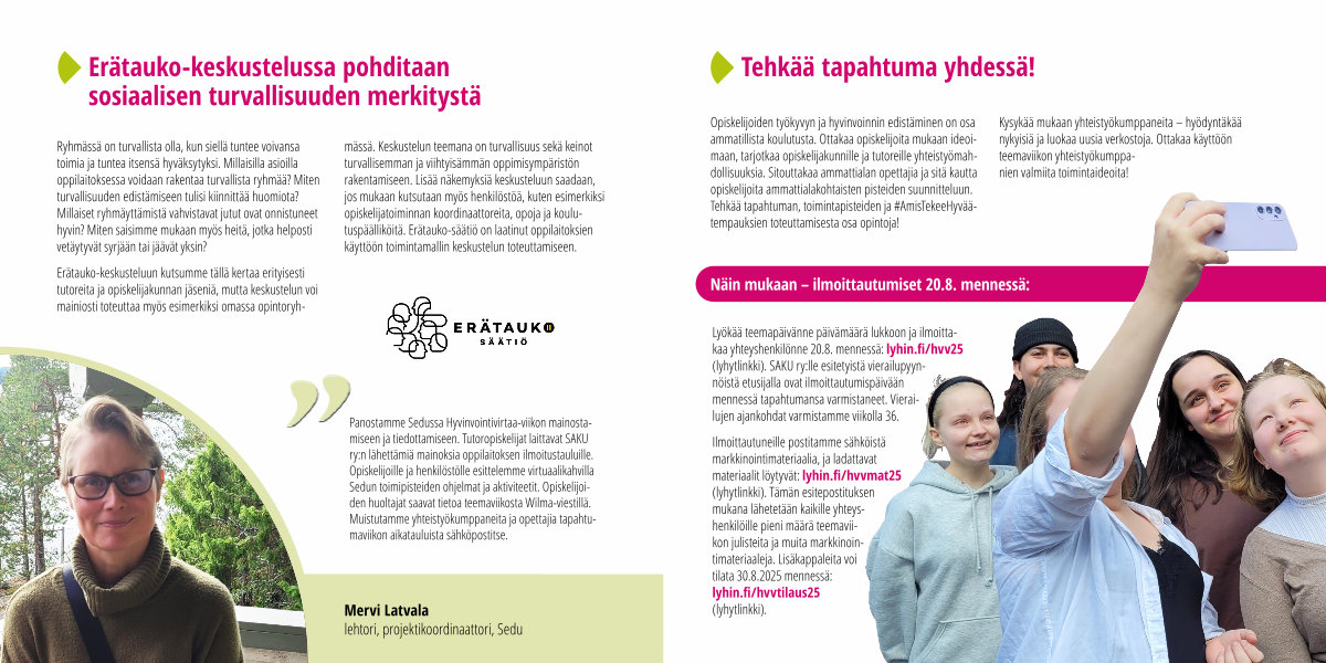Erätauko-keskusteluun kutsumme tällä kertaa erityisesti tutoreita ja opiskelijakunnan jäseniä, mutta keskustelun voi mainiosti toteuttaa myös esimerkiksi omassa opintoryhmässä. Keskustelun teemana on turvallisuus sekä keinot turvallisemman ja viihtyisämmän oppimisympäristön rakentamiseen. Lisää näkemyksiä keskusteluun saadaan, jos mukaan kutsutaan myös henkilöstöä, kuten esimerkiksi opiskelijatoiminnan koordinaattoreita, opoja ja koulutuspäälliköitä. Erätauko-säätiö on laatinut oppilaitoksien käyttöön toimintamallin keskustelun toteuttamiseen.