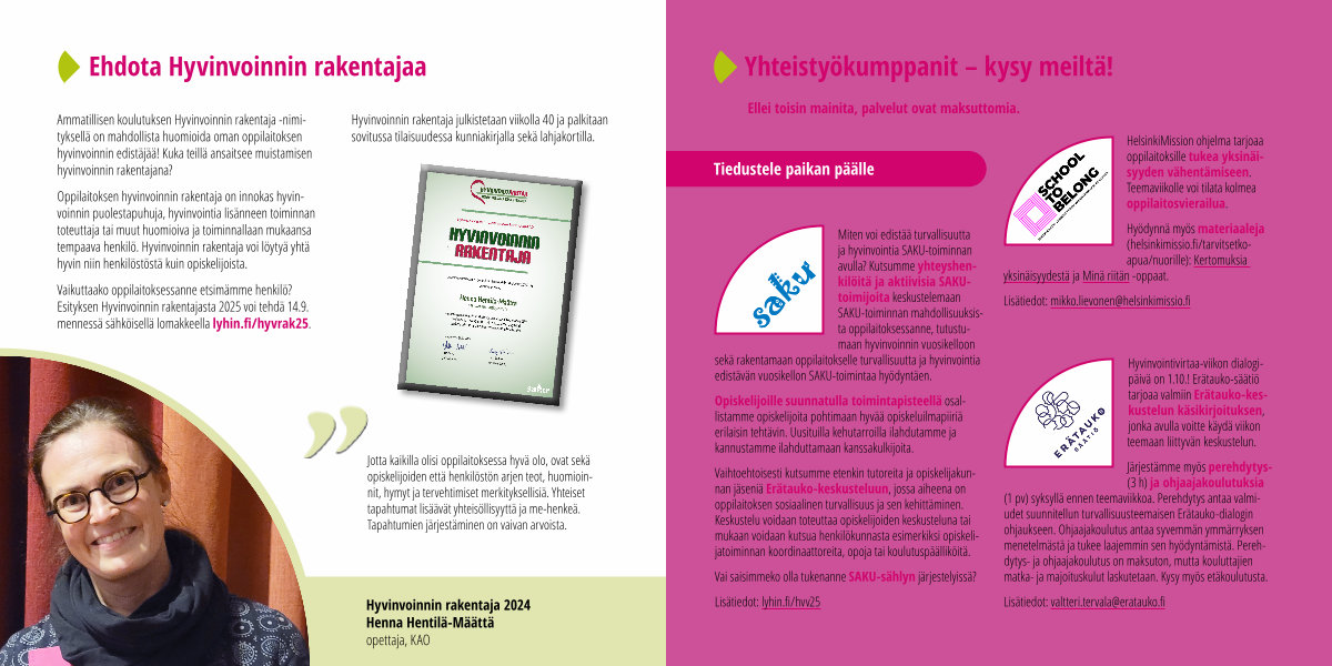 Miten voi edistää turvallisuutta ja hyvinvointia SAKU-toiminnan avulla? Kutsumme yhteyshenkilöitä ja aktiivisia SAKUtoimijoita keskustelemaan SAKU-toiminnan mahdollisuuksista oppilaitoksessanne, tutustumaan hyvinvoinnin vuosikelloon sekä rakentamaan oppilaitokselle turvallisuutta ja hyvinvointia edistävän vuosikellon SAKU-toimintaa hyödyntäen.