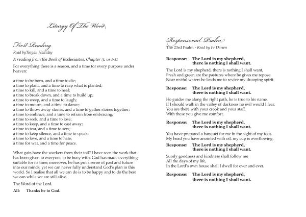 The Lord is my shepherd , there is nothing I shall want , Fresh and green are the pastures where he gives me repose . Near restful waters he leads me to revive my drooping spirit .