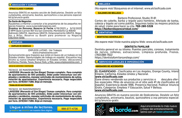 EL CLASIFICADO - Clasificados en Los Angeles , Orange County , Inland Empire , California , Estados Unidos y Nacional . www . elclasificado . com Gane dinero vendiendo sus productos y servicios o descubra ofertas especiales . Miles de anuncios en el sitio web # 1 de clasificados en español . Experiencia desde 1996 . Presencia Nacional . Publicar Anuncio Gratis . Categorías : Empleos Y Educación , Salud Y Belleza . www . elclasificado . com