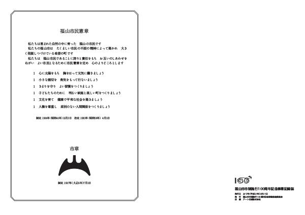 福山市市制施行100周年記念事業記録誌 発行日 2017年(平成29年)3月31日 発 行 福山市市制施行100周年記念事業推進委員会 印 刷 アート印刷株式会社