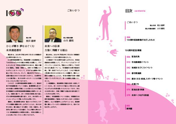 目次 contents ごあいさつ 福山市長 枝 福山市議会議長 小川 直幹 眞和 004 100周年記念事業がめざしたもの 100周年記念事業 006 記念式典 010 市民提案型イベント 042 地域まちづくりイベント 044 都市間連携 046 歴史・文化・音楽、スポーツ等イベント 060 広報・PR 076 記念出版・映像 078 未来へつながる取組 083 資料編