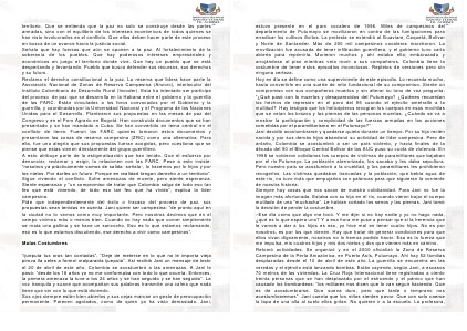 territorio. Que se entienda que la paz no solo se construye desde las partes armadas, sino con el equilibrio de los intereses económicos de todos quienes se han visto involucrados en el conflicto. Que ellos deben hacer parte de este proceso en busca de un avance hacia la justicia social. Señala que hay fuerzas que aún se oponen a la paz. Al fortalecimiento de la soberanía de los pueblos. Que hay poderosos intereses empresariales y económicos en juego el territorio donde vive. Que hay un pueblo que se está despertando y levantando. Pueblo que busca defender sus recursos, sus derechos y su futuro. Reclama el derecho constitucional a la paz. La reserva que lidera hace parte la Asociación Nacional de Zonas de Reserva Campesina (Anzorc), interlocutor del Instituto Colombiano de Desarrollo Rural (Incoder). Esta ha intentado ser partícipe del proceso de paz que se desarrolla en la Habana entre el gobierno y la guerrilla de las FARC. Están vinculados a los foros convocados por el Gobierno y la guerrilla, y coordinadas por la Universidad Nacional y el Programa de las Naciones Unidas para el Desarrollo. Plantearon sus propuestas en las mesas de paz del Congreso y en el Foro Agrario en Bogotá. Han construido documentos que se han presentado y se han mandado a Cuba. Se han convertido en tema central en el conflicto de tierra. Fueron las FARC quienes tomaron estos documentos y presentaron las zonas de reserva campesina (ZRC) como una alternativa. Para ella, fue una alegría que sus propuestas fueran acogidas, pero cuestiona que se piense que estas vienen directamente del grupo guerrillero. A esto atribuye parte de la estigmatización que han tenido. Que el esfuerzo por denunciar, reclamar y exigir, lo relacionen con las FARC. Pese a esto insiste: ?nosotros ya prácticamente vamos de salida -señala-, lo hacemos por lo hijos y por los nietos. Por darles un futuro. Porque en realidad tengan derecho a un territorio?. Sigue viviendo el conflicto. Sufre amenazas de muerte, pero siente esperanza. Siente esperanza y ?un compromiso de tratar que Colombia salga de todo eso tan feo que está viviendo, de todo eso tan feo que ha vivido?, explica la líder campesina. Pide que independientemente del éxito o fracaso del proceso de paz, sus propuestas sean tenidas en cuenta. Jani quiere ser campesina: ?de pronto aquí en la ciudad no lo vemos como muy importante. Pero nosotros decimos que en el campo vivimos más o menos bien. Cuando no hay nada que comer simplemente se mata una gallina y se hace un sancocho. Eso es lo que estamos reclamando, eso es lo que estamos discutiendo, ese derecho a vivir como campesinos?. Malas Costumbres ?ijueputa tus oras tan contadas?, ?Deje de meterse en lo que no le importa vieja pirova lla ueles a formol malparaida ijueputa?. Así recibió Jani un mensaje de texto el 20 de abril de este año. Colombia se acostumbró a las amenazas. A Jani le pasó: ?desde los 16 años yo no me conformaba con todo lo que ocurría. Entonces, la primera amenaza la tuve a los 24 años y se han seguido y se han seguido?. La voz tranquila y suave que acompañan sus palabras transmite una calma que nada tiene que ver con lo que está diciendo. Sus ojos siempre están bien abiertos y sus cejas marcan un gesto de preocupación permanente. Parecen agotados, como de quien ya ha visto demasiado. Jani,