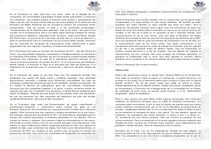 En el Putumayo no todo está bien. Los lunes, antes de la llegada de las compañías, las comunidades organizaban mingas donde palancaban y construían sus carreteras. Jani protesta porque la empresa está usando y apropiándose de estas y de las vías terciaras construidas por las comunidades. En la resolución del Ministerio del Medio Ambiente que les concede la licencia, las compañías tienen compromisos: ?vías de acceso al área y a las locaciones proyectadas?, ?compensación de la infraestructura afectada?, dice la de Vetra. ?De igual forma sucede con la infraestructura vial la cual debe seguir estrictas medidas de manejo para prevenir su deterioro?, especifica la de Amerisur. Jorge Coral Rivas, Alcalde del Puerto Asís, se pronunció el 9 de mayo de este año en contra de Amerisur y pidió la cofinanciación para la culminación de la vía para tráfico pesado. Denunció que los vehículos de transporte de hidrocarburos están deteriorando a pasos agigantados las vías, algunas viviendas y el sistema de alcantarillado. En el Putumayo las cosas no van bien. En Noviembre de 2011- año del informe de Vetra-, las comunidades indígenas, campesinas y afrodescendientes se declararon en Asamblea Permanente. Haciendo uso de sus derechos constitucionales legales plantearon tres exigencias: el cese de la explotación petrolera mientras no se revise la licencia ambiental de octubre de 2010. La no construcción del Oleoducto desde Teteyé a la Estación el Tigre en el Municipio del Valle del Guamuez. Y la Asignación de presupuesto para la construcción y ejecución del plan integral de vida. En el Putumayo las cosas no van bien. Para Jani ?las petroleras también han propiciado una ruptura del tejido social y conflictos laborales?. Han sembrado desconfianza, discordia y rivalidad entre diferentes comunidades. Se valen de promesas y prebendas económicas que le han facilitado ?comprar conciencias?. Se ha violado el derecho de participación para las comunidades campesinas. Denuncia que las compañías engañan a la gente: cuadran reuniones donde les explican que solo van a ?socializar? sus proyectos. La gente firma la asistencia para recibir el refrigerio. ?Resulta que esa firmas las han pasado como una aprobación de que las personas han sido partícipes del desarrollo del plan del manejo ambiental del territorio?, denuncia la líder campesina. En el Putumayo algo anda mal. Contaminación de aguas superficiales y subterráneas. Captación o vertimientos sobre fuentes de agua en los bosques. Reducción del ecosistema por aprovechamiento forestal de la cobertura vegetal: Vetra reconoce que hay impactos y riesgos ambientales en lo que hacen. Sin embargo, argumentan que durante el 2011, se desarrollaron estrategias para el manejo del material particulado y emisiones generadas en sus labores. Para el manejo de fluidos y residuos. Para prevenir fugas de hidrocarburos en los pozos. Para evitar la erosión hídrica. Para el uso correcto del agua. Que reforestaron. Que trataron el agua residual para reducir sustancias químicas en ella. Que vigilaron la calidad de esta y que cumplieron las reglas. Que hubo nueve derramamientos, un incremento del 50% con respecto al año anterior, pero es porque el volumen de producción aumentó. Que fueron los contratistas de transportes los causantes del