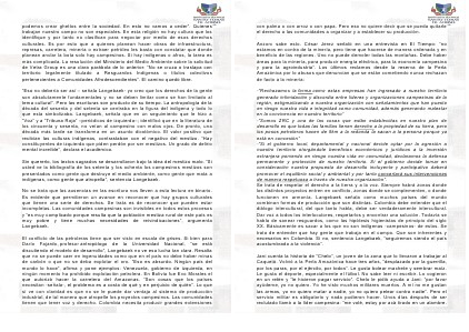 con palma o con arroz o con papa. Pero eso no quiere decir que se pueda quitarle el derecho a las comunidades a organizar y a establecer su producción. Anzorc sabe esto. César Jerez señaló en una entrevista en El Tiempo: ?no estamos en contra de la minería, pero tiene que hacerse de manera ordenada y en beneficio de las regiones. Uno no puede demoler todas las montañas. Debe haber áreas para la minería, para producir energía eléctrica, para la economía campesina y para la agroindustria?. Los últimos reclamos desde la reserva de la Perla Amazónica por lo abusos que denuncian que se están cometiendo nunca rechazan de facto a la minería: -”Rechazamos la forma como estas empresas han ingresado a nuestro territorio generado intimidación y discordia entre líderes y organizaciones campesinas de la región, estigmatizando a nuestra organización con señalamientos que han puesto en riesgo nuestra vida e integridad como comunidad, además generando malestar en la convivencia en nuestro territorio“ -”Somos ZRC y una de las cosas que están establecidas en nuestro plan de desarrollo es que todas las familias tienen derecho a la propiedad de su tierra, pero los posos petroleros hacen de 5km a la redonda la sacan a la persona porque ya está en concesión” -”Si el gobierno local, departamental y nacional decide optar por la agresión a nuestro territorio otorgándole beneficios económicos y jurídicos a la inversión extranjera poniendo en riesgo nuestra vida en comunidad, declaramos la defensa permanente y protección de nuestro territorio. Si el gobierno decide tomar en consideración nuestra propuesta de desarrollo incluyente y participativo deberá promover el equilibrio social y ambiental y por tanto concertará sus intervenciones de manera respetuosa a través de nuestra organización”. Se trata de respetar el derecho a la tierra y a la voz. Siempre habrá zonas donde los distintos proyectos entren en conflicto, zonas donde se complementen, o donde funcionen en armonía. Langebaek señala como muchos países del mundo combinan formas de producción que son distintas. Colombia debe entender que el diálogo intercultural, del que tanto habla, debe ser verdaderamente intercultural. Dar voz a todos los interlocutores, respetarlos y encontrar una solución. Todavía se habla de sanear resguardos, como las hipótesis higienistas de principio del siglo XX. Básicamente es sacar a los que no son indígenas -campesinos- de estos. Se trata de entender que hay gente que trabaja en el campo. Que son inherentes y necesarios en Colombia. Si no, sentencia Langebaek, ?seguiremos siendo el país acostumbrado a la violencia?. Jani cuenta la historia de ?Chelo?, un joven de la zona que lo llevaron a trabajar al Caquetá. Volvió a la Perla Amazónica hace tres años, ??