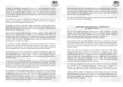 El video es demasiado conspirativo e incurre en varias imprecisiones y datos acomodados. Por ejemplo, el ICA ha demostrado que el control de las semillas es anterior al TLC, que las semillas de arroz son casi todas nacionales y que la siembra de variedades criollas no está prohibida. Y que aquel arroz fue destruido porque estaba empacado en bolsas de agroquímicos que lo hacían inservible para el consumo humano. Pero Solano tiene razón en muchas de sus denuncias. Es cierto que el TLC va a quebrar a los campesinos y también que el Estado colombiano los ha dejado a merced de las multinacionales como Monsanto. El mercado de semillas ?mejoradas? obliga al agricultor a comprar plaguicidas y fertilizantes a precios exorbitantes, mientras el ICA dice que no puede intervenir estos precios porque eso iría contra el libre mercado. El mismo cuento que nos echaron con los medicamentos. Hace un par de años los algodoneros de Córdoba perdieron 70.000 millones de pesos en una cosecha que se malogró por las semillas de Monsanto. Por supuesto que el ICA, tan severo con los campesinos de Huila, no fue capaz de mandarle la Policía a la multinacional, ni destruir sus cuestionadas semillas. Por el contrario, estas se siguieron vendiendo como si nada. La culpa fue del invierno, dijo Monsanto, y el Gobierno le creyó. A propósito de semillas ?mejoradas?, la del maíz, que pertenece en el 75 % a multinacionales, tampoco pelechó en Montes de María el año pasado. Y adivinen quién tuvo la culpa esta vez: ¡el verano! Si no es por el maíz criollo, que da una mazorca pequeña poco comercial, la gente estaría pasando física hambre. Nuestra Amazonía ha sido envenenada por el glifosato de Monsanto desde hace más de una década, por cuenta del Plan Colombia. Y si no se han podido frenar las fumigaciones de los cultivos ilícitos, a pesar de ser costosas, dañinas e ineficientes, es en buena medida por la enorme influencia que tiene Monsanto en el gobierno gringo. Prueba de ello son los cables de Wikileaks divulgados en 2010 por Julian Assange, en los que consta que funcionarios del Departamento de Estado han hecho cabildeo en 113 países a favor de las grandes empresas de biotecnología. En otras palabras, a favor de Monsanto, que tiene el 80 % de la biotecnología del planeta. En Colombia este cabildeo ha funcionado bastante bien. El año pasado Le Nouvel Observateur publicó en su portada un informe científico que prueba que el maíz NK630 de Monsanto les produjo tumores y daños renales y hepáticos a ratas de laboratorio. En Francia se abrió una gran controversia política y jurídica que todavía no termina. Este maíz está prohibido en 23 países y apenas en 12 se vende para consumo humano. Colombia es uno de ellos, por supuesto. De nuevo, el ICA le da el beneficio de la duda a la multinacional y se apoya en conceptos científicos que critican la metodología de aquel informe.