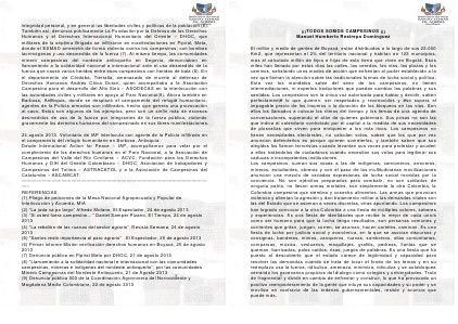 ¡¡¡TODOS SOMOS CAMPESINOS ¡¡¡ Manuel Humberto Restrepo Domínguez El millón y medio de gentes de Boyacá, están distribuidos a lo largo de sus 23.000 Km2, que representan el 2% del territorio nacional y habitan en 123 municipios, más el calculado millón de hijos e hijas de esta tierra que viven en Bogotá. Esos miles han llenado por estos días las calles, las veredas, las vías, las plazas y los caminos, señalando unos modos de acción que enfrentan al poder establecido a la vez que llaman la atención sobre las tradicionales formas de lucha social y política. Esta vez los mandatos salen del seno de los campesinos, no tienen intermediaciones, ni expertos traductores que puedan cambiar las palabras y sus sentidos. Los campesinos son la única voz autorizada para hablar y decidir, saben perfectamente lo que quieren: ser respetados y reconocidos y eso supera el impagable precio de los insumos o la duración de los bloqueos en las vías. Son ellos los llamados a colocar los ritmos del tiempo y los temas de una agenda de conversaciones, superando el afán de quienes gobiernan. Sus prisas n ?6???2VR??F?6V?6?V?F&??6??G&??F??"V?6?F???VF?FFR7W2?V6W6?FFW2FR?W7f?:?2VR6?'fV?&V?&?VV6W"??2?:2&?6?2???26?W6???2??F?V?V??V6W6?FFW2V?V7F?&?W2???6?7V??f?F?2?6&V?VR??2VR?"fW??V?6??FVfV?FW&??2W2?'VRV?W&V?6??WFW&??2??F?&?:??6&V?VR7W2V?Vv?F?2??2????FW'&?&?7F27V?F??Wf?F?7W2f?6W2&&?FW7F"?7VFV?V???2G&L:?F???2FR6?VFF??27V?F??V6W6?F?7W2f?F?2&?Vv?F??"7W26GV62R??6??WFV?FW2??7F?GV6???W2???26?W6???2?7V??7W2f?6W2?2FR??L:?vV?2?6???W&?2?'&?6W&?2???W&?2?W7GVF??FW2??'&W&?2?6??V?6?FR?2?V?F?GVF??&?2??f???6???W2?V?6??V??W?6?FRf&?F2W?&W6???W2FR?V6?6?6????f?F2?"?6??6?V?6????6??V?:?&6?F?2&W&F?2&6??&F?"???6??6??FF?2FR???wV?G&??????Wf?&?2??'F?W2?6??6???V?V?FR??G&6????&???6????&?6?W6??VR6?V?'&?6?6V6???V?F?2??2&?2VR&?f?6?f???V?6???V?F??w&W6?;6??F?G&F?V?F???F"?2FV??F2f?F?W26???2FV?W7FF?VR6R6???fV6W2F?67&WF2??G&2V?F?F????26?W6???2????w&F?6??f?6"??G&6????&?V?f?W7FFR?;??F??W26???&W2?6&W&W2?W?W&?V?6?2?W2V?f?W7FFR?FV?F?FFW2VR&V6?&R???V??"FR6FV???6???6W"?V???&VR??V6?FV?v&W7V?FF?2?6??W'6??26??V?W2?6?'&?V?FW2VRw&?F???VVv??6?'&V??6R6?????6V?6'FV?W2?6????W2V?f?W7FFR?V6??"?W7F?6?6?6???V6??;6?6?V??VR6R6?6??F?67W'6?2?6??6?v?2?&?FW&2????2???VW&?2?'V?2?6??'&W&?2????26??V??F&?2?6??'62??;?6?6?fW7GV&??2??V????W2?w&f?F?2?VG&V2????F2VR6RVV???&'&?6F2???26:?F?2?&?62??VVv?2FR?'&2?W2V?f?W7FVR?VW7F??FW67V&?W'F?VRV?W7FF?6&V6RFR?Vv?F??FB?66?FB&&W6??fW"?2FV??F27V?F?6RG&FFRF?6"V?f??F?FR??2FV?2?V?7R&VV????W6?gVW'??&?F?7V????V?????????&?F?7V???6RWF?&??VV6W'&?F???2W66V?&??2&??6??2FV?F???v?6???6??Vv??2?V??fW'6?FFW2?G&FFRg&v?V?F"?F?f?F?"V?6?&??FRV?g&V?F"?6??7G'V?"???VR?&?f?6F?V??6?F?f?&VV??FW&?V?F?FR?vV?FRVR??GW?R7W266?FFW2?7R?FW"?6R??f???V?6??G&l:?FR?2;7&FV?W2wV&W&??V?F?W2?&W6?7FR??V?6?VRVVFR?:2?