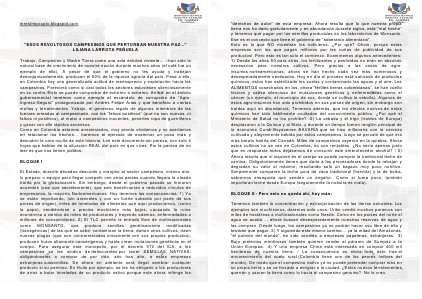 "ESOS REVOLTOSOS CAMPESINOS QUE PERTURBAN NUESTRA PAZ..." LILIANA LARROTA PEÑUELA Trabajo, Campesino y Madre Tierra como una sola entidad viviente… –han sido la natural base de crecimiento de nuestra nación durante muchos años (el café fue un ejemplo de ello). A pesar de que el gobierno no les ayuda y trabajan desorganizadamente, producen el 60% de la riqueza agraria del país. Pese a ello, en Colombia hay una generalizada actitud de menosprecio y explotación hacia los campesinos. Pareciera como si casi todos los sectores estuviesen silenciosamente en su contra. Esto se puede comprobar de extremo a extremo. Arriba: en el ámbito gubernamental tenemos como ejemplo el escándalo de corrupción de ?AgroIngreso-Seguro? protagonizado por Andrés Felipe Arias y que beneficio a ciertas mafias y terratenientes. Yabajo, el generoso regalo de algunos miembros de las fuerzas armadas al campesinado, con los ?falsos positivos? (que no son nuevos, ni falsos ni positivos), al matar a campesinos inocentes, ponerles ropa de guerrilleros y ganar con ello rápidos ascensos. Como en Colombia estamos anestesiados, muy pronto olvidamos y no acertamos en relacionar los hechos… haremos el ejercicio de examinar un poco más y descubrir la cara oculta de esta historia. Lee este documento sin pereza, son solo 4 hojas que hablan de la situación REAL del país en que vives. Por la pereza de no leer es que nos tienen jodidos. BLOQUE I El Estado, durante décadas descuido y margino al sector campesino, menos aún, lo preparo o equipo para llegar competir con otros países cuando llegara la oleada traída por la globalización. Sin embargo, desde el gobierno pasado se firmaron acuerdos (casi que secretamente), que solo beneficiarían a reducidos círculos de empresarios, la mayoría Norteamericanos. Hoy tenemos las consecuencias: 1) Ya se están importando, (sin aranceles y con un fuerte subsidio por parte de sus países de origen), miles de toneladas de alimentos que aquí producíamos, (como la papa), vendiéndose a precios muchísimo más bajos, causando la ruina económica a cientos de miles de productores y trayendo además, enfermedades a millones de consumidores. 2) El TLC permite la entrada libre de multinacionales como MONSANTO, que produce semillas genéticamente modificadas (transgénicas) de las que se sabe: contaminan la tierra, dañan otros cultivos, traen nuev as plagas (que son contrarrestadas únicamente con sus propios productos), producen frutos altamente cancerígenos y hasta crean mutaciones genéticas en el cuerpo. Para asegurar este monopolio, por el decreto 970 del ICA, a los campesinos se les sindica de delincuentes por tener SEMILLAS NATIVAS, obligándoseles a comprar de por vida, año tras año, a estas empresas extranjeras sussemillas. De ahora en adelante será ilegal sembrar cualquier producto si su permiso. En Huila por ejemplo, se les ha obligado a los productores de arroz a botar toneladas de su producto nativo porque este ahora infringe los