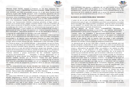 fuera ineficiente, sino porque, a sabiendas del mal que vendría, él no estaría dispuesto a ceder y sabía que la pugna con el pueblo seria larga y dura. Algo semejante hizo, cuando al ver que iba perdiendo frente a Antanas Mockus en las elecciones del 2010, cambio de repente todo su grupo de asesores publicitarios. Algo inusual, pero la cosa le funciono. Le creímos y lo elegimos. BLOQUE III ALGUNOS PROBLEMAS “MENORES”: -A pesar de ser un país con una fuerte vocación y tradición agrícola… no hay infraestructura para el agro. Los campesinos para llevar sus productos a la ciudad, tienen que pagar altos costos en fletes. A propósito, ¿qué han hecho con el dinero de los pedajes? Un estudio indica que tendríamos ya las mejores carreteras del mundo si se hubiesen empleado eficientemente. -En los acopios de comida (como CORABASTOS) los carteles de monopolio establecidos intervienen y corrompen las cadenas alimentarias y arbitrariamente le ponen precio a los productos, afectando al pequeño agricultor. -También están los amigables y desinteresados BANCOS que sangran al campesino con sus créditos y no perdonan retrasos en los pagos, si el campesino perdió su cultivo por el alto costo de los insumos, el mal clima o la manipulación artificial de los precios, esto no importa, tiene que pagar o será embargado. Aprovechando esto, redes de mafiosos en todo el país (desde el cuenta-gota en adelante) han entrado a hacer el papel de peligrosos prestamistas. -La educación que se les da a sus niños y jóvenes no está diseñada para que puedan prosperar y desarrollen el campo. Lo que sí es notorio es que tienen que salir de sus tierras y buscar empleo en la ciudad regalando su trabajo, llenando de miseria y delincuencia las grandes urbes. Los pueblos y los campos se están quedando solos. -Y me pregunto si en estos colegios a los muchachos los concientizan de lo que está pasando y como solucionarlo. No, ni en sueños! Al pueblo hay que mantenerlo dormido, que no se atreva a reflexionar ni reaccionar. -El sistema de recreación y esparcimiento al que pueden acceder los campesinos es, para su desgracia: DEGRADANTE: reinados de belleza, pólvora, cerveza y música de la peor clase los mantienen contentos. Los alcaldes se encargan de reforzar esto en nombre de la ?cultura? haciendo fiestas que cuestan millones y contratando grupos musicales que nada aportan al crecimiento real de la gente (pero que si engordan los bolsillos de los contratistas). Díganme, ¿están Jhoani Ayala, el Charrito Negro, Pipe Bueno apoyando la causa del campesinado? ¿Por qué no invertir más bien ese dinero en microempresas campesinas? -Salud: las casas farmacéuticas, que diseñan medicamentos para esconder los síntomas pero dejar intacta la enfermedad, acabaron con nuestra muy eficaz tradición herbólasela y de remedios caseros a base de plantas. Eso ahora nos parece superstición y atraso. Lo irónico es que Empresas gringas han patentado plantas y frutos curativos del Amazonas. En adelante ningún nativo podrá usarlas, en tanto que nos son vendidas en masa como modernos y eficaces productos sintetizados por sus laboratorios. OTROS APUNTES interesantes: -Tenemos petróleo… y lo exportamos, sí. Sin embargo, como sucede en Irak, tenemos una de las gasolinas más caras del mundo. –En Corea (que nos compra