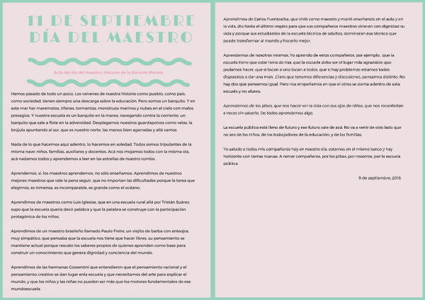 Yo saludo a todos mis compañeros hoy en nuestro día, estamos en el mismo barco y hay horizonte con tierras nuevas. A remar compañeros, por los pibes, por nosotros, por la escuela pública.