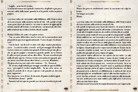 infiniti, poiché all’infinito si estendevano, scomparendo oltre l’angolo composto da un’altra infinita fila di scaffali.