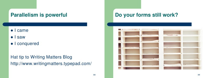 Parallelism is powerful I came ? I saw ? I conquered ? Hat tip to Writing Matters Blog http://www.writingmatters.typepad.com/ 88